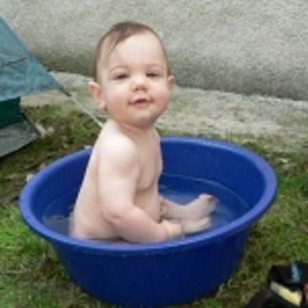 Kis víz hűsít a legjobban a nyári forróságban. Kislányunk itt 8 hónapos. Nagyon élvezte a fürdést a szabadban.